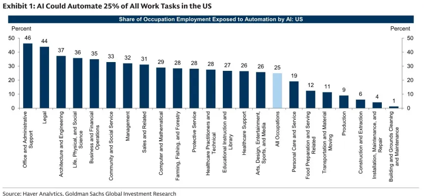 替代规模:基于美国劳工部O*NET数据库的分析显示,AI有望自动化25%的工作任务,这一比例远超常规结构性变化的影响