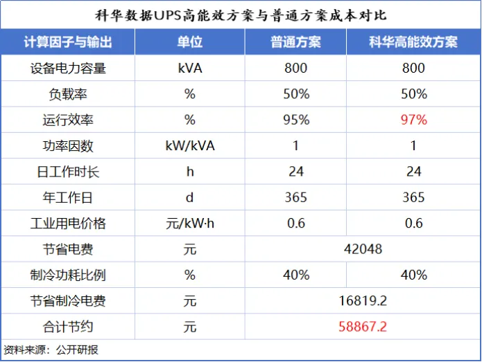 虽然只有两个百分点的差距,但以单台800kVA的UPS为例,使用科华数据的高效系统,单台设备一年能够节省电费近6万元。