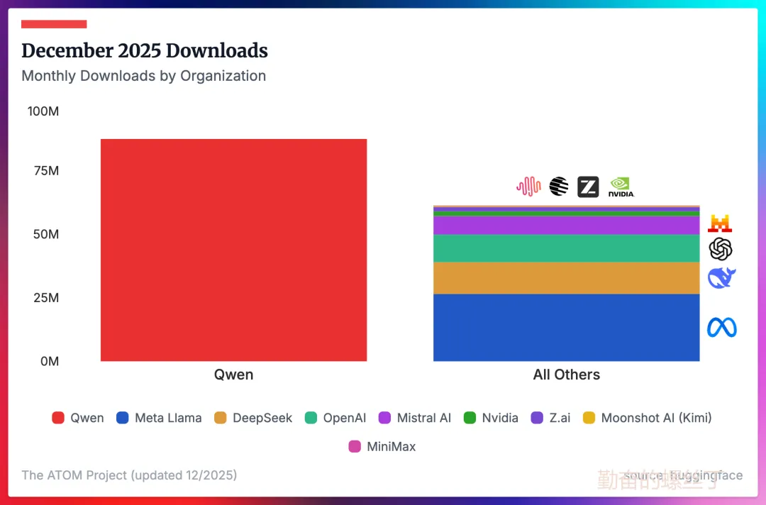 Qwen的全面加速:Qwen已成为从本地部署、推理加速到多模态工具的默认首选。其下载量在2025年持续攀升,并在年底确立了显著的规模优势。