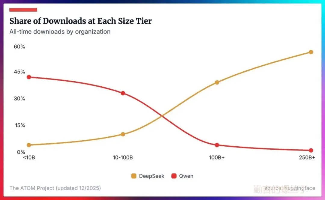Qwen的短板与DeepSeek的机会:在大模型(Large Models)层级,尤其是MoE架构上,DeepSeek(特别是V3和R1版本)在过去两年中保持领先。Nathan Lambert指出,“只有在超大规模参数大模型这一层级,才存在与Qwen竞争的机会。”