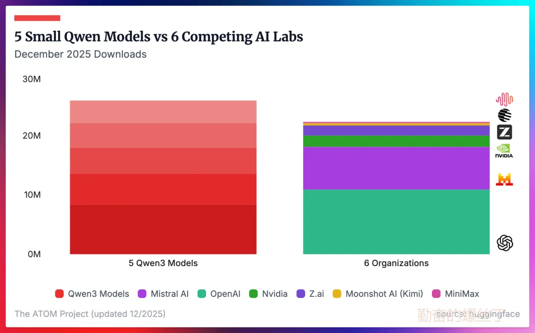 Qwen的生态位:仅统计2025年12月,下载量最高的5个Qwen3模型(涵盖0.6B到8B参数),其总下载量就超过了OpenAI、Mistral AI、Nvidia、Z.ai、Moonshot AI 和MiniMax所有模型的总和。这种量级上的差距,显示了Qwen在中小参数模型领域的绝对主导地位。