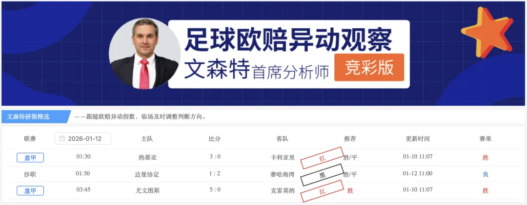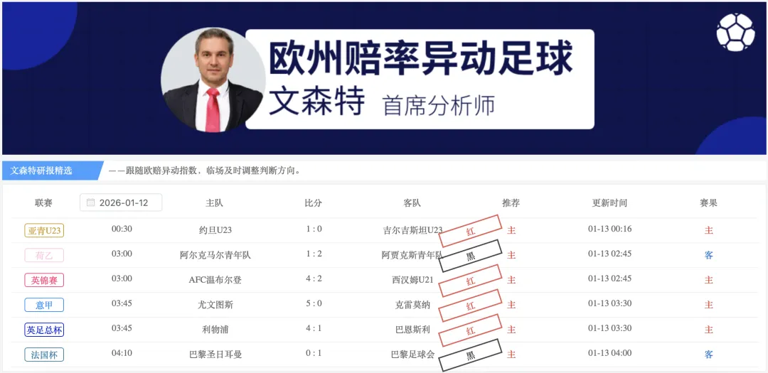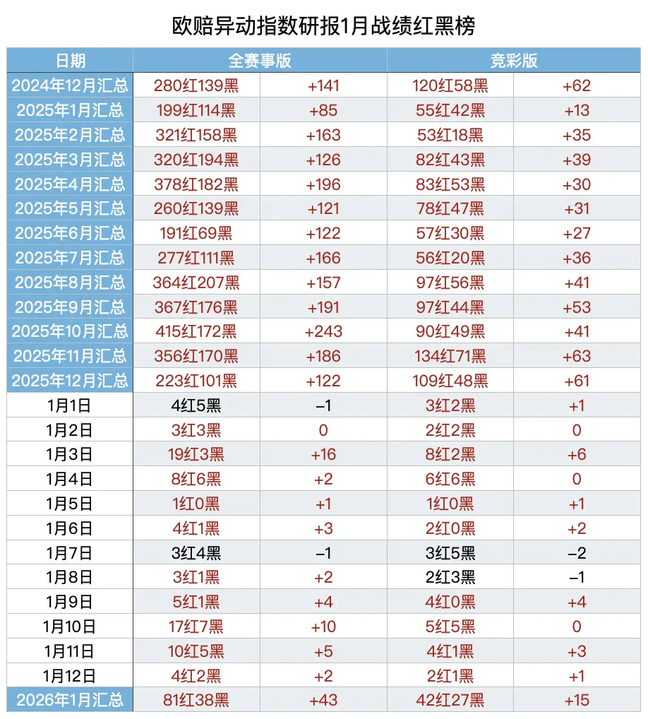 【欧指异动指数】(全赛事版)栏目的研报给出6场比赛,4红2黑,1月累计81红38黑,净胜43,观察20家主力公司的临场指数变化,掌控比赛方向,1月稳定性达到68.1%。