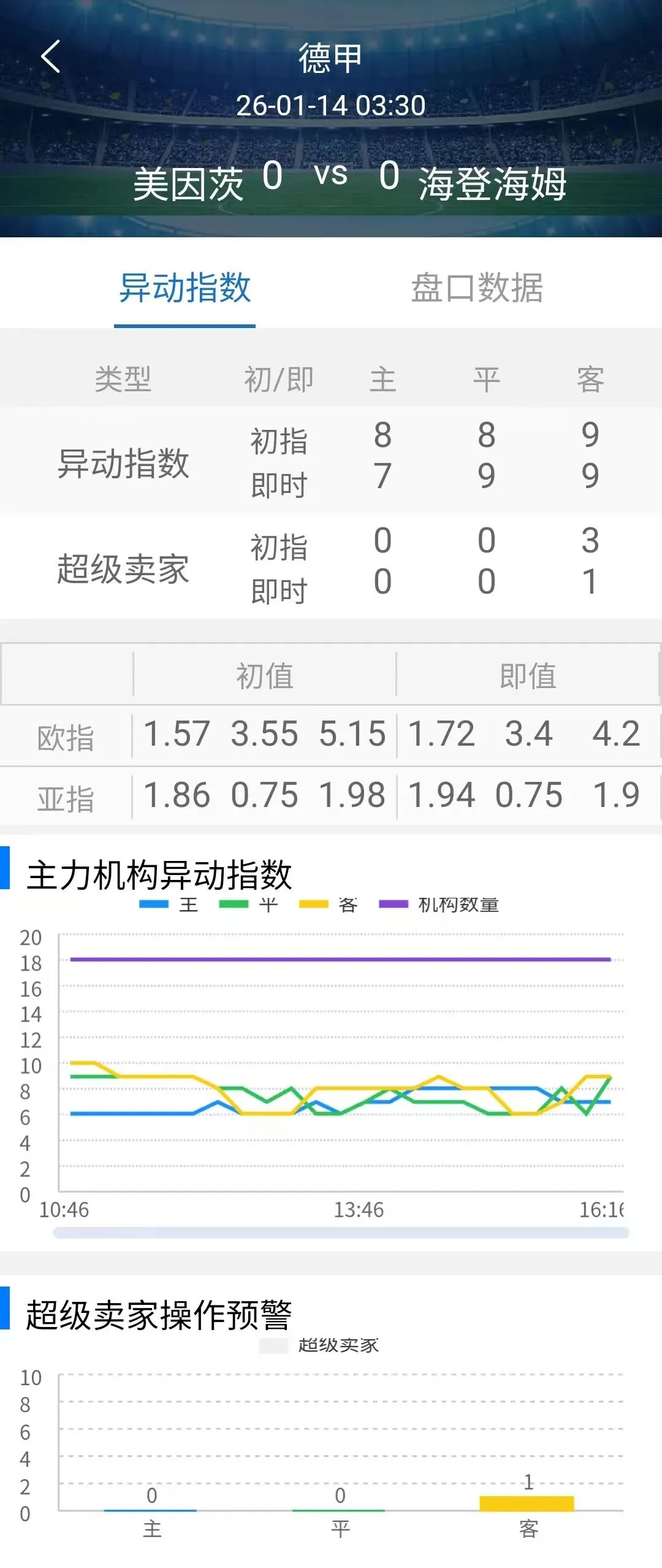 超卖指数初指:0-0-3,发生客超卖,临场:0-0-1,客超卖始终维持,海登海姆难以求胜。