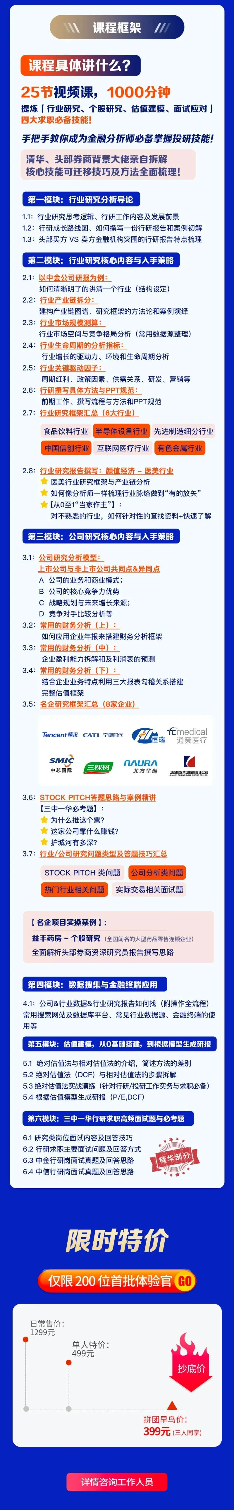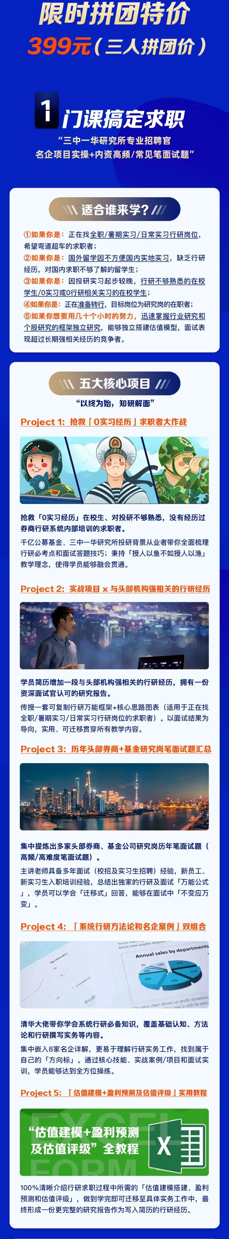 如果你也有以上困难,小编特此准备了【行业研究核心技能课】,针对同学们在行业研究实操过程中的遇到的难题,逐一精选经典案例项目!大家可以通过“行业研究-个股研究-估值建模-面试应对,四大求职必备!”的顺序,教你学会如何完成一份完整的行研报告!【报名方式】