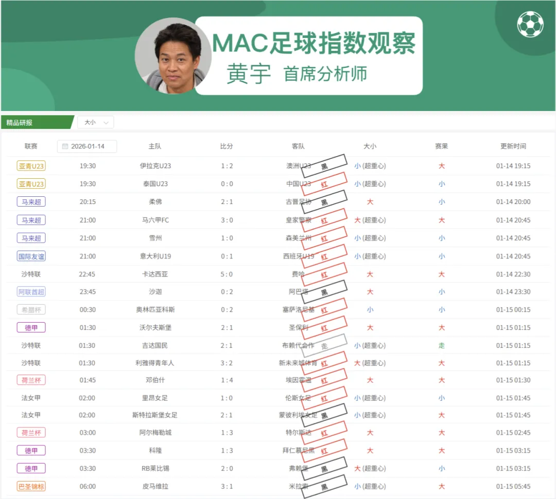 关注MAC足球指数观察研报,精心挑选每日赛事,随着指数变化时刻进行调整。研报已经为大家直接指明方向,简单明了,胜率值得信赖,只需选择心仪的比赛直接出手。