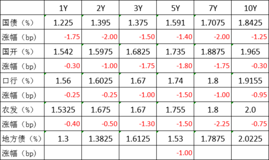 截止17:15,利率债二级市场中,利率成交价格总体呈下跌趋势,其中下跌程度较大的有2年期国债,收益率下跌2bp,报1.395%;7年期农发债,收益率下跌2.25bp,报1.8%;5年期国开债,收益率下跌1.8bp,报1.735%,7年期国债,收益率下跌2bp,报1.7075%。