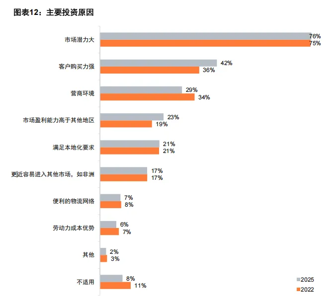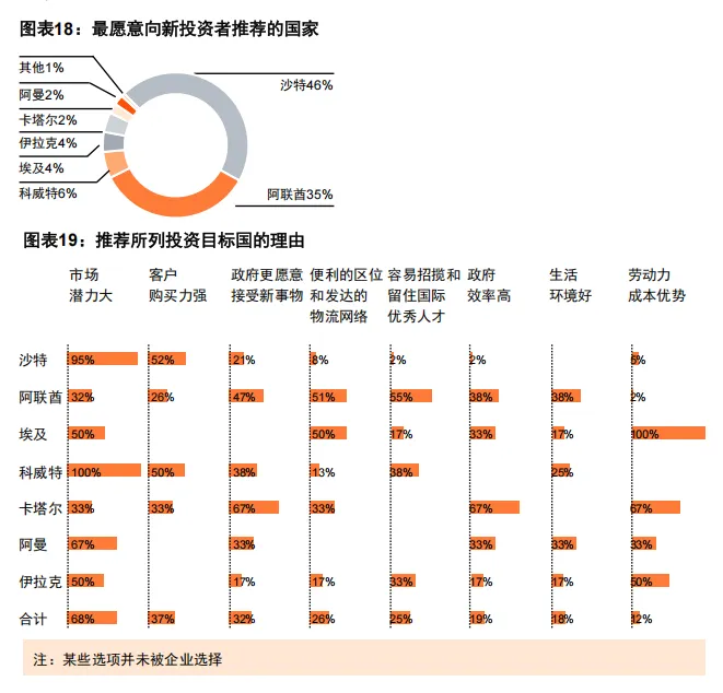 ——76% 的受访企业认为中东“市场潜力大”,特别是阿联酋、沙特和埃及被看做是投资目标国。42% 看重“客户购买力强”,23% 认为“市场盈利能力优于其他地区”。