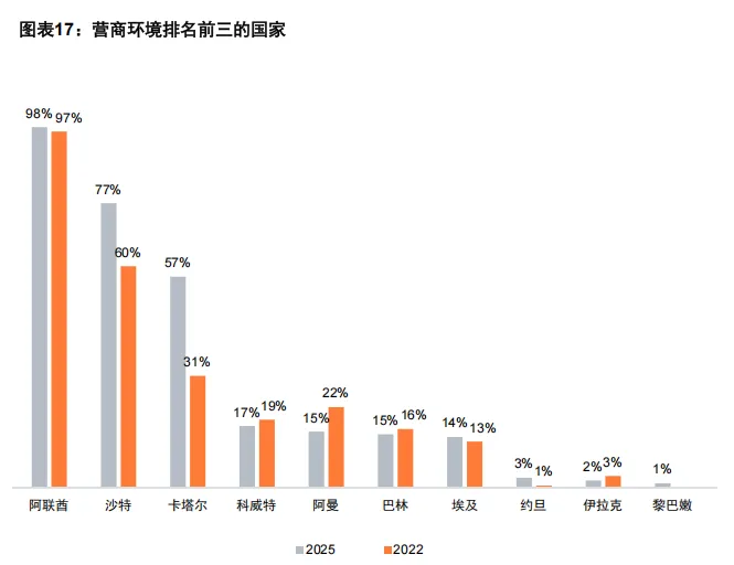 半数企业认为中东营商环境优于其他地区,较2022年提升5%。阿联酋、沙特和卡塔尔被评为营商环境最好的三个国家。