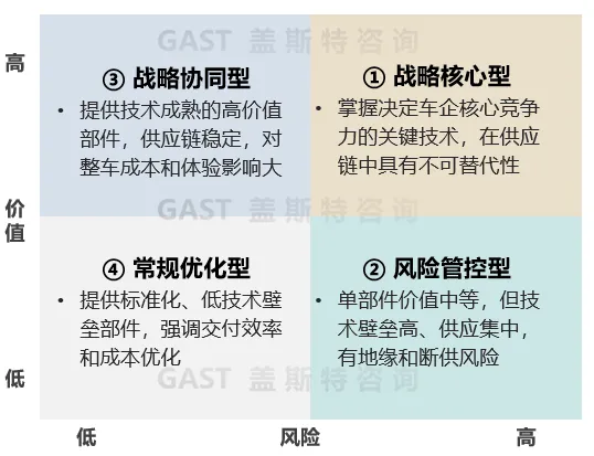 一是,战略核心型供应商,在供应链中具有不可替代性,掌握决定车企核心竞争力的技术,如高算力AI芯片、智能驾驶域控制器供应商;二是,风险管控型供应商,属于单部件价值中等,但技术壁垒高、供应集中,存在地缘或断供风险,如车规级MCU、高压连接器供应商;三是,战略协同型供应商,是指提供技术成熟的高价值部件,对整车成本控制和用户体验影响大,如动力电池、多合一电驱供应商;四是,常规优化型供应商,是指提供标准化、低技术壁垒部件,强调交付效率与成本优化,如低压线束、车身前后端防护件供应商。