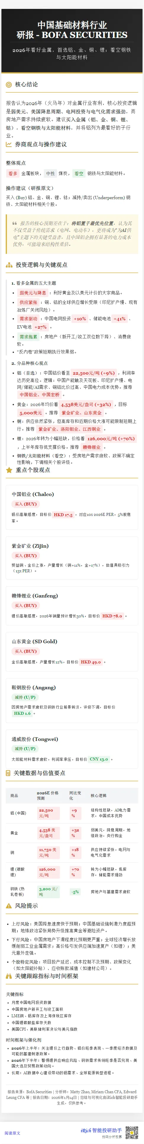 美银证券(BofA Global Research)发布了针对中国基础材料行业(H/A股)的年度展望报告,标题直指“结构性短缺与成本优势”。这份长达数十页的深度研究,旗帜鲜明地将铝列为2026年首选(Top Pick)子行业,同时看好黄金、铜等金属的上涨潜力。报告不仅大幅上调了多个商品价格预测和目标价,还警示了锂、水泥等领域的风险。本文将深度拆解这份报告的底层逻辑,挖掘数据背后的投资机会。