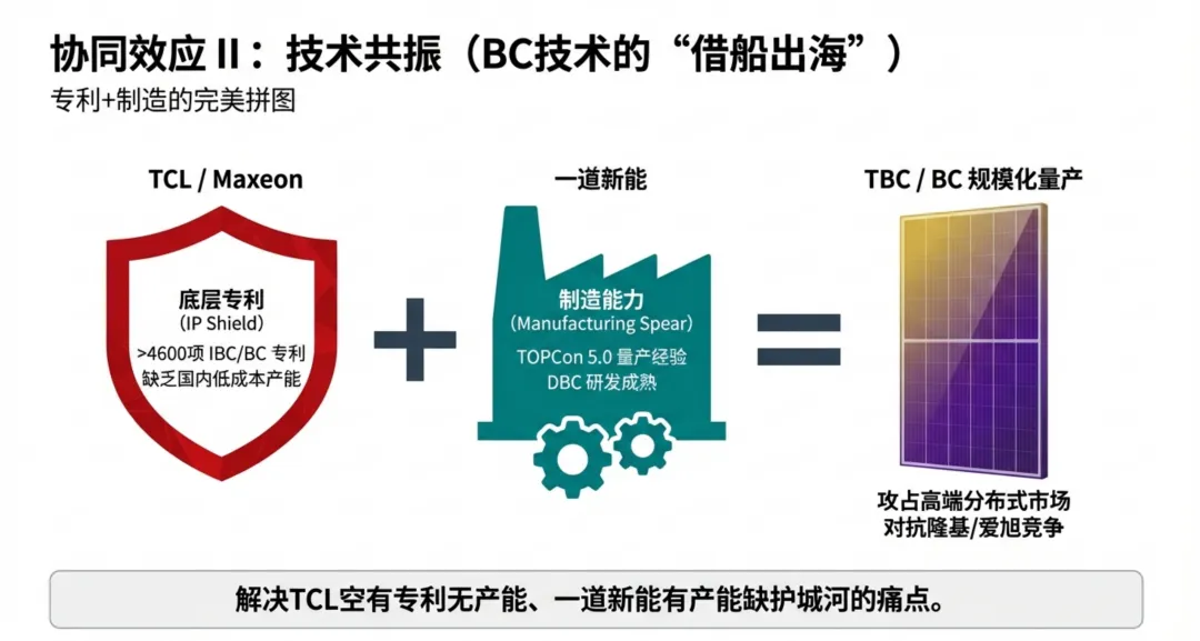 • 战略修正,不得不发: 2025年的巨亏证明了纯粹的“硅片专业化”模式在下行周期中的极度脆弱性。收购一道新能源,实则是通过“补课”下游,为庞大的硅片产能寻找“泄洪口”。 • 估值底部的“捡漏”: 一道新能源作为2023年全球组件出货前十的“新一线”企业,IPO终止后陷入流动性困局。TCL中环此时介入,有望以极低代价控制优质资产。 • BC技术的“借船出海”: 这是本案最大的看点。利用Maxeon的IBC专利+一道的成熟制程,打造“TBC”产能,是实现技术差异化的唯一路径。