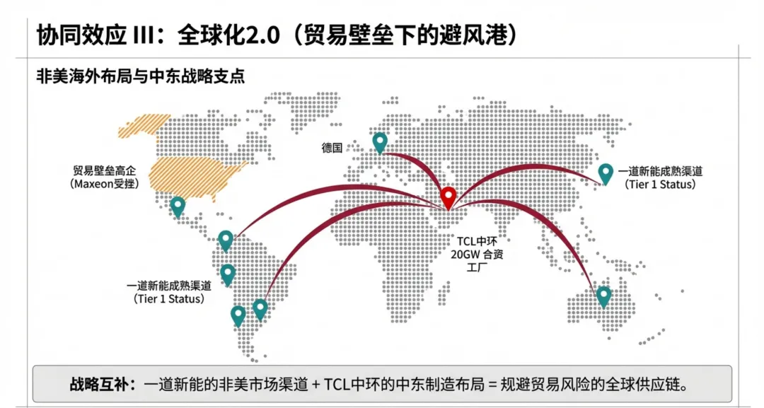 • 轨道一 (Maxeon):🇺🇸 专注美国重组Maxeon,剥离非美资产,打造完全“去中国化”供应链,吃透美国市场的高溢价。 • 轨道二 (TCL中环+一道):🌏 专注非美市场 (RoW)一道的产品(低成本)贴上SunPower或TCL牌子,销往欧洲、中东和亚太。