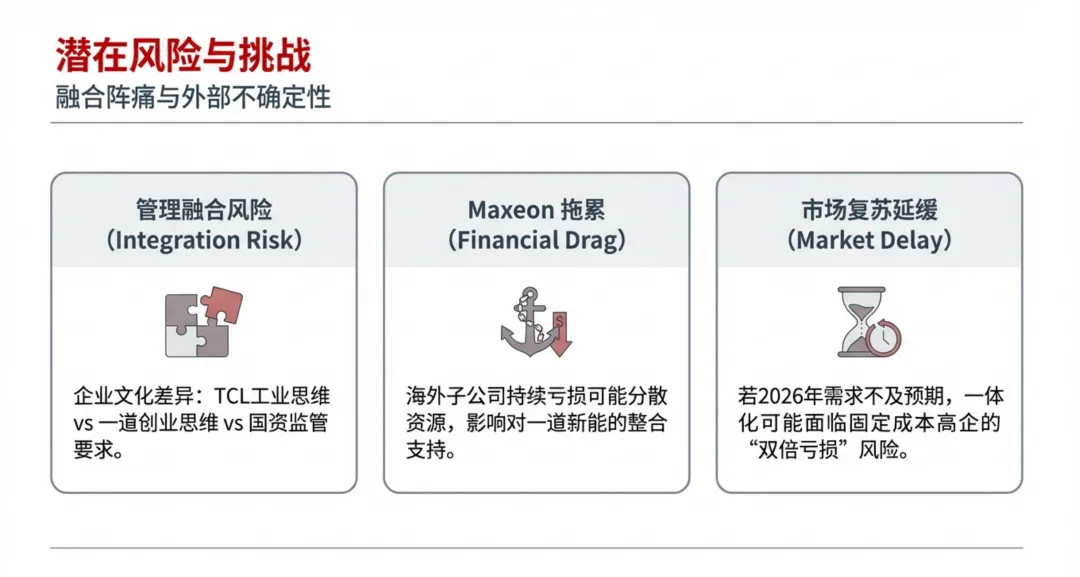 1. 商誉减值: 达摩克利斯之剑。 2. 负债并表: 合并后负债率可能突破75%警戒线。 3. 整合风险: 国资背景与民营机制的冲突。