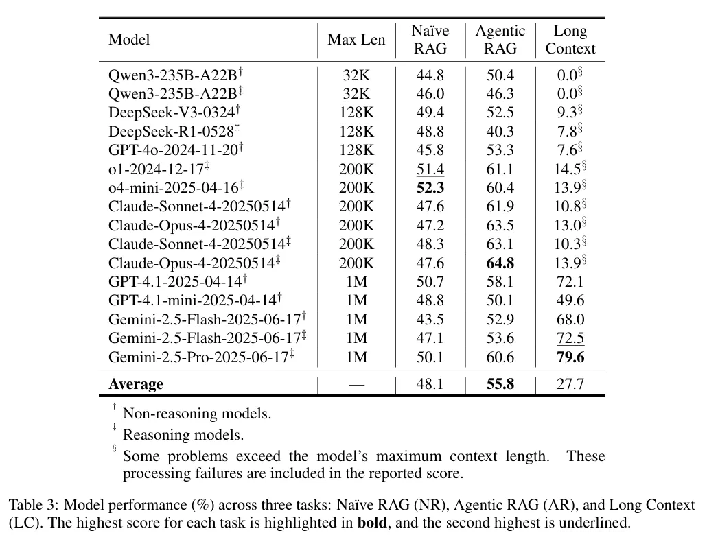 研究团队在 SagaScale 上评估了多种前沿 LLM 及三种长文本处理方法(Long Context, Naïve RAG, Agentic RAG),主要发现如下: