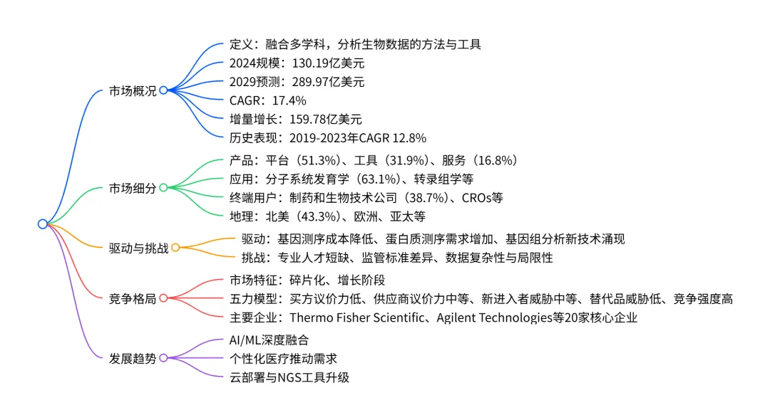 全球生物信息学(Bioinformatics)市场正处于高速增长阶段,2024 年市场规模达 130.19 亿美元,预计 2029 年将增至 289.97 亿美元,CAGR 达 17.4%,增量增长 159.78 亿美元;市场以北美为最大区域市场(2024 年占比 43.3%)、平台为核心产品(2024 年占比 51.3%)、分子系统发育学为主要应用(2024 年占比 63.1%)、制药和生物技术公司为主要终端用户(2024 年占比 38.7%),亚太地区和转录组学应用增长最快,驱动因素包括基因测序成本降低、蛋白质测序需求增加等,同时面临专业人才短缺、监管差异等挑战,市场呈碎片化特征,Thermo Fisher Scientific、Agilent Technologies 等为主要参与者。
