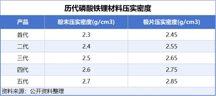 目前,磷酸铁锂已经发展至第四代产品“高压实密磷酸铁锂”,即压实密度2.6g/cm³以上的磷酸铁锂材料为高压密磷酸铁锂材料。