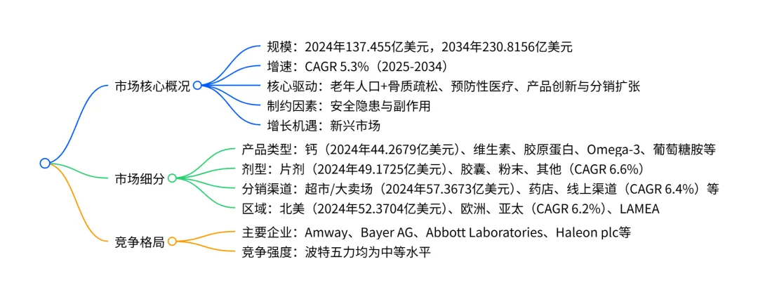 市场规模与增长:2024 年全球骨骼健康补充剂市场规模为137.455 亿美元,预计 2034 年将达到230.8156 亿美元,2025-2034 年复合年增长率(CAGR)为5.3%。 核心影响因素: 驱动因素:老年人口增长与骨质疏松症负担加重(全球 65 岁以上人口 2050 年将达 16 亿)、预防性医疗意识提升与营养缺乏问题凸显、产品创新(如植物基配方、便捷剂型)与分销渠道扩张(线上 + 线下全覆盖)。 制约因素:产品安全隐患与副作用(如过量补钙增加心血管疾病风险)、优质产品成本高、低收入地区认知不足。 增长机遇:新兴市场(亚太、拉美等)的老龄化加剧与健康意识提升,个性化营养、植物基补充剂等创新方向。