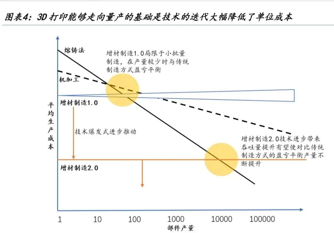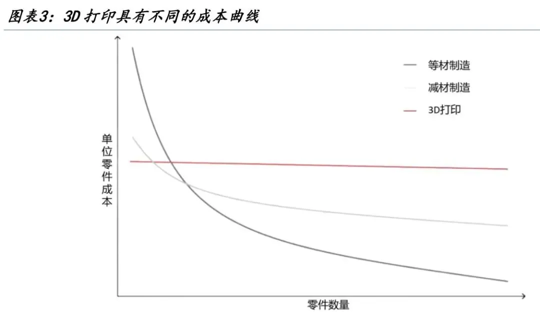 3D打印相比传统加工方式,通过省去模具或工装的需求大幅降低了初始成本,但其成本优势会随着生产规模的扩大而减弱,3D 打印的优势需要综合考虑设计复杂度、生产批量以及、交付周期等。