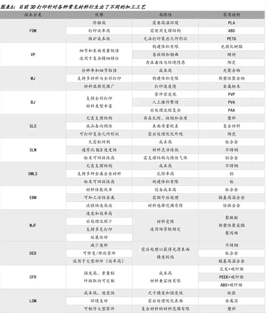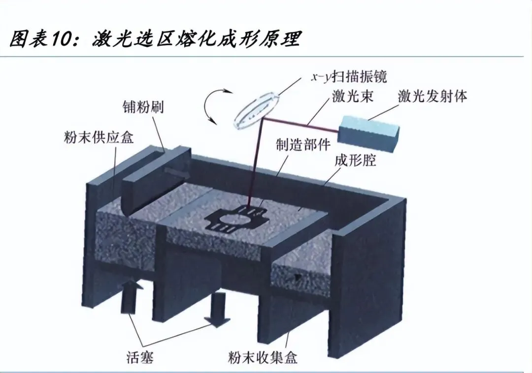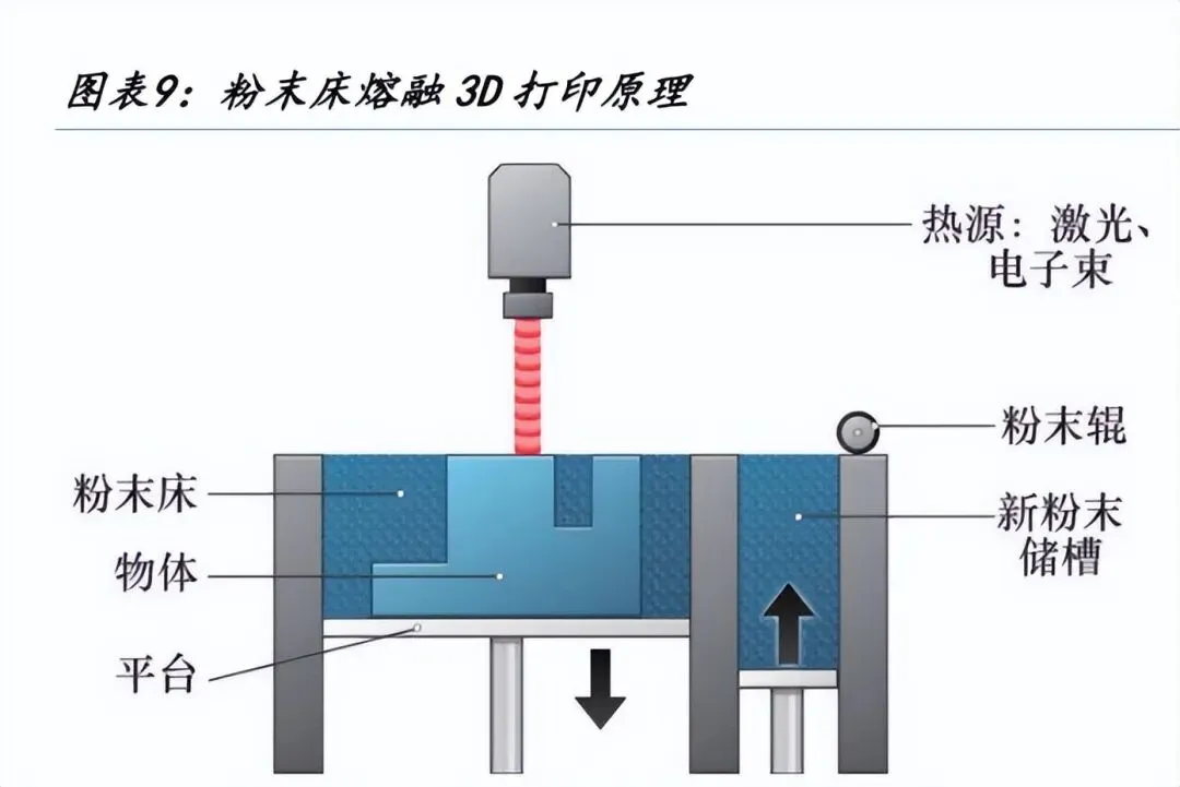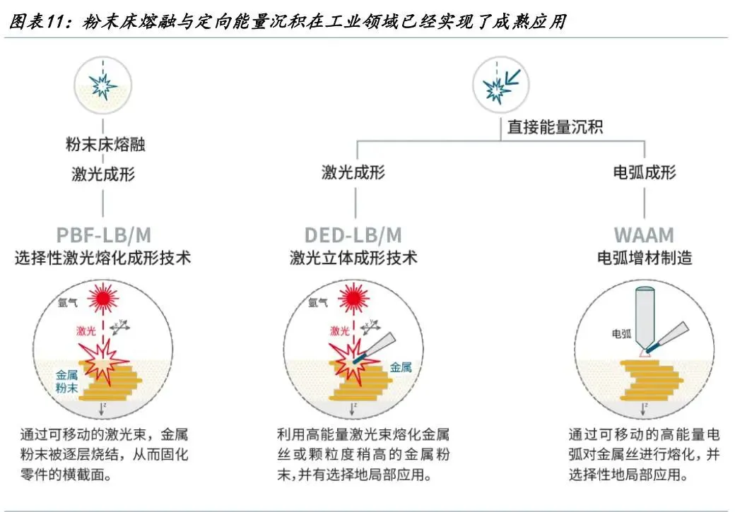 粉末床熔融工艺是指通过热能选择性地熔化/烧结粉末床区域的增材制造工艺。代表性工艺有激光选区熔化、激光选区烧结、电子束选区熔化。该技术路线的选材较为广泛,从尼龙到金属粉末都可以作为烧结对象。目前该技术路线在工业领域已经实现了成熟应用,通常会一起使用进行加工的还有定向能量沉积技术,通过直接熔化材料并将它们逐层沉积在工件上来制造零件,这种增材制造技术主要用于金属粉末或线材原材料。