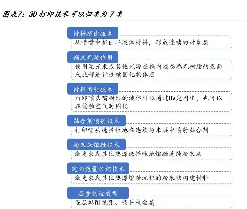 目前3D打印针对各种常见材料,衍生出了不同的加工工艺,从大的分类来看一般将3D打印分为7 类,主要包括材料挤出(Material Extrusion)、光聚合(Photopolymerization)、粉末床熔融(Powder Bed Fusion)、材料喷射(MaterialJetting)、黏结剂喷射(Binder Jetting)、片材层压(Sheet Lamination)和定向能量沉积(Di rected Ene rgy Deposition)。