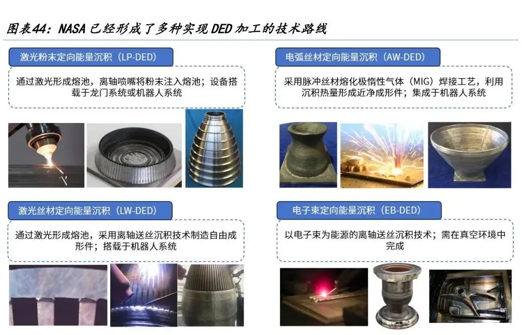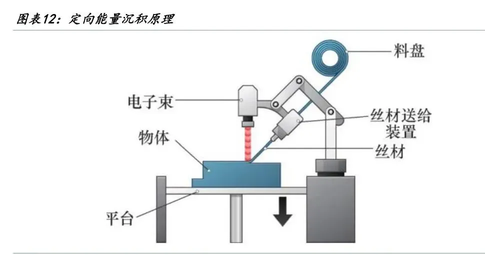 定向能量沉积包含了激光粉末成形、激光定向能量沉积、气溶胶喷射、电子束增材制造、激光沉积焊接等技术路线,和粉末床熔融相比,定向能量沉积可以在一个零件上打印不同的材料,同时可以用于损坏修复,可加工的尺寸往往也比粉末床熔融更大。