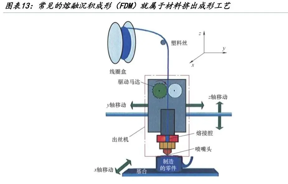 材料挤出成形是最常见和便宜的 3D 打印技术路线,消费级的 3D 打印主要就是采用该技术路线进行聚合物 3D 打印。使用热塑性材料的连续长丝作为基材,细丝从一个线圈通过一个移动的加热打印机挤出机头进料,通常缩写为挤出机(Extruder)。熔融材料从挤出机的喷嘴被挤出,并首先沉积到 3D 打印平台上,该平台可以加热以获得额外的附着力。
