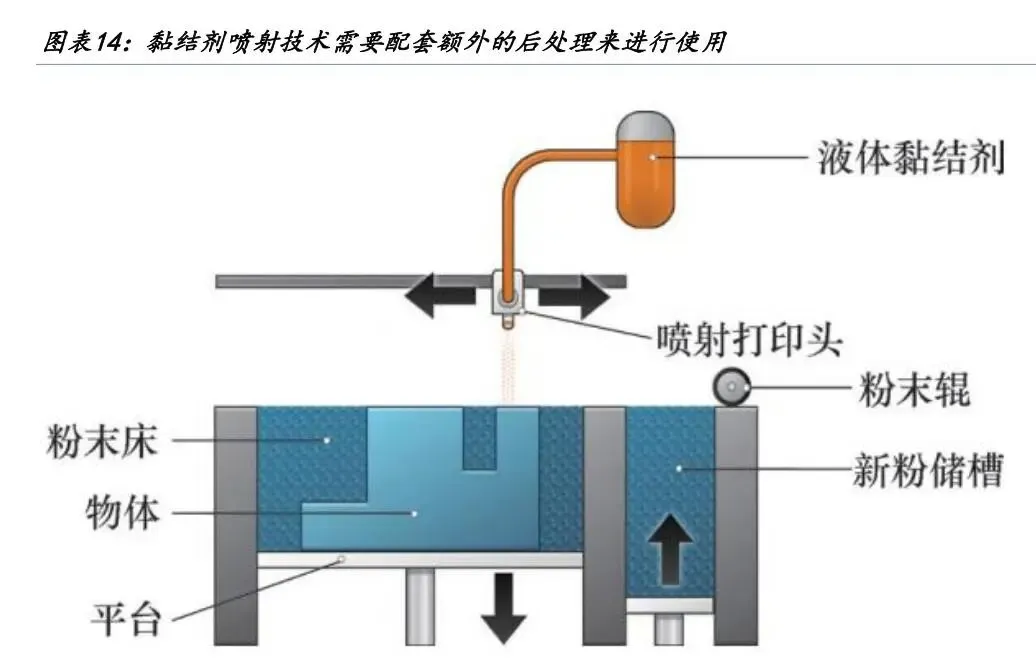 黏结剂喷射技术需要同时使用粉末与黏结剂,在黏结剂喷射 3D 打印过程中,3D 打印头在构建平台 X 轴和 Y 轴上水平移动,沉积黏结剂液滴,以类似于在纸上打印墨水的 2D 打印机的方式打印每一层。当一层完成时,支撑打印物体的粉末床的平台会向下移动,一层新的粉末散布到构建区域上。该过程逐层重复,直到所有部分完成。打印后,零件处于生坯或未完成状态,需要经过额外的后期处理后才能使用。
