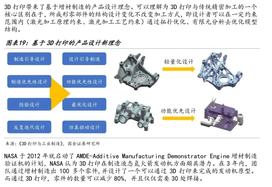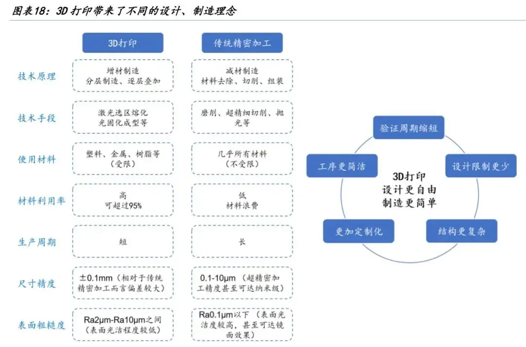 从减材制造到增材制造,3D 打印突破传统制造方式限制,带来完全不同的设计理念。传统机械加工方法主要是减材制造,在其制造过程中材料逐渐减少以完成最终成形,或使用模具完成等材制造。3D 打印所属的增材制造则打破了传统制造方式限制,利用数字化技术直接完成产品成形,让3D打印完全颠覆了原有制造业设计方式,创造了为增材制造而设计的产品,带来了不可替代的巨大优势。