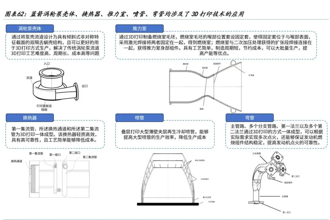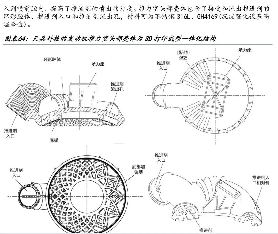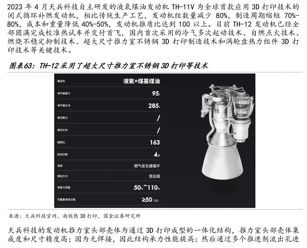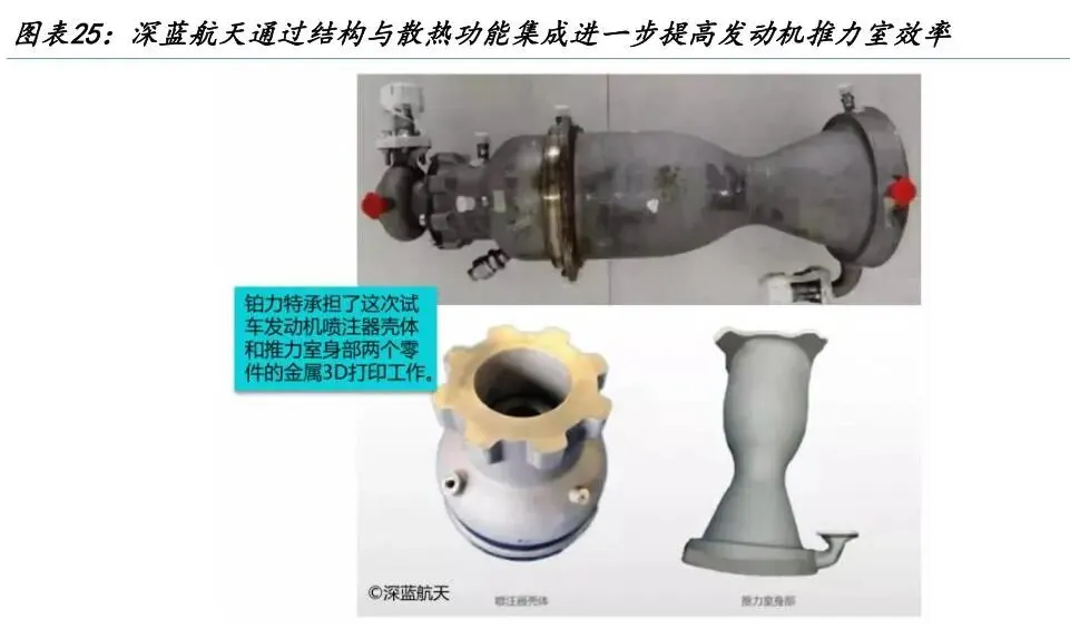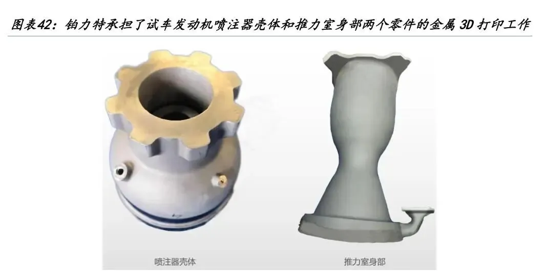 蓝箭航天 2019 年就开始和铂力特合作,铂力特已助力蓝箭航天朱雀三号可重复使用火箭首次大型垂直起降飞行试验任务、朱雀二号遥二运载火箭发射任务等取得成功。根据蓝箭航天招股说明书信息,蓝箭针对减轻发动机结构质量的需求,优化了发动机组件和总装设计,大量采用增材制造技术、高精度铸造技术等,TQ-12B 发动机推重比达到 162。该技术应用于天鹊系列液氧甲烷发动机。