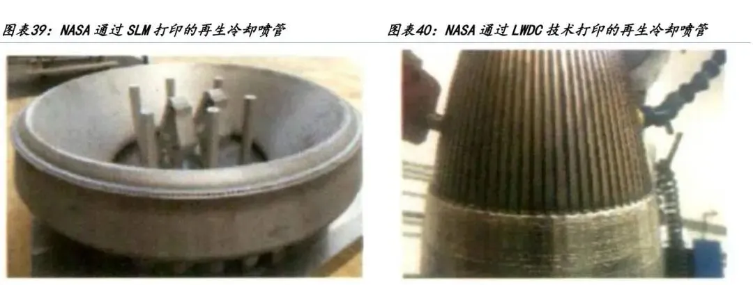 喷管和燃烧室:发动机的再生冷却喷管是发动机推力室的重要组件,也是一种典型的薄壁结构,传统的制造方法是采用锻造/钣金/旋压,然后机加工、铣槽和热处理,最后通过钎焊等方法连接,由于低温和流动对壁面的设计要求,还需进行表面加工和制造公差等后处理工作,采用 3D打印将大幅简化该过程。NASA 从 2013 年开始研究 3D 打印再生冷却喷管,SLM 和 LWDC(Laser Wire Direct Closeout)技术均有尝试。