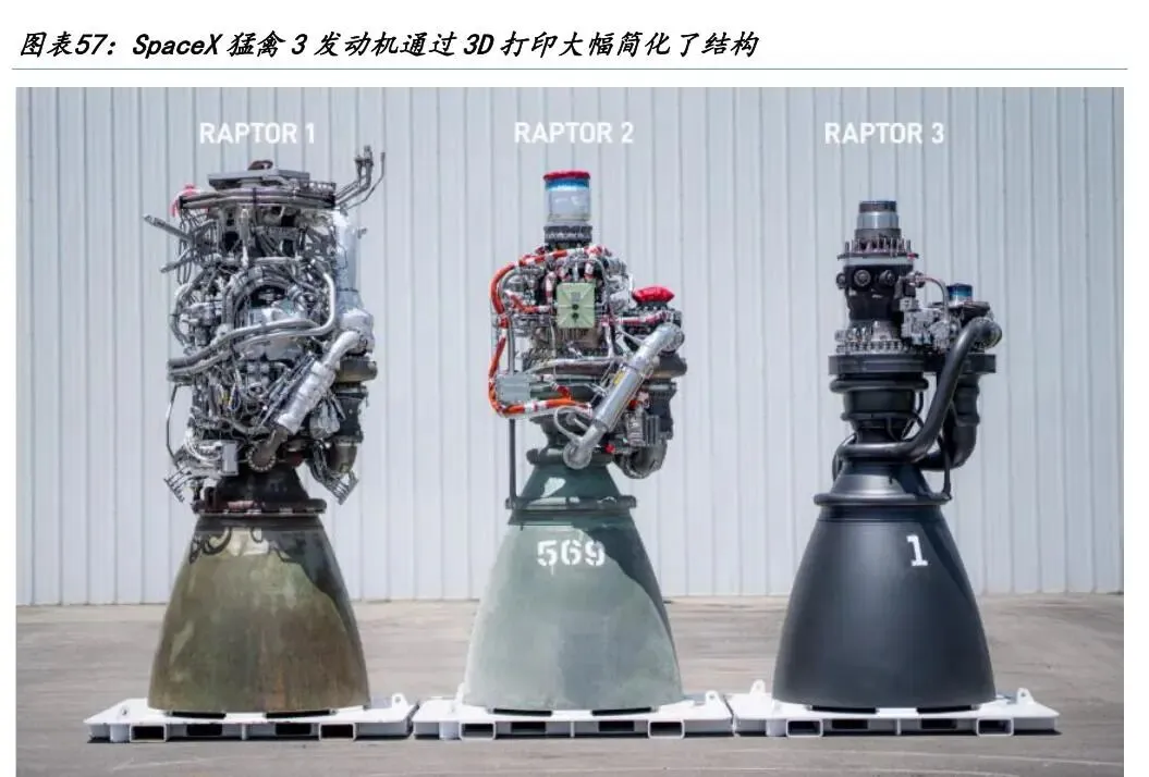 SpaceX 最新迭代的猛禽(Raptor)发动机通过 3D 打印技术实现了更精简、集成化的设计,猛禽 3 SN1 简化了结构,将次级流道内置于机体,并为外露部件配备了再生冷却系统。因此,猛禽 3 无需再使用隔热罩,这不仅减少了额外的重量与复杂度,连灭火系统也一并省去了。