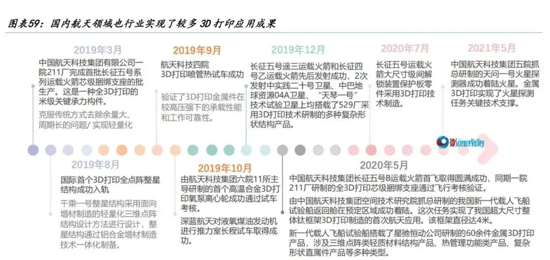 3D 打印在赋能紧凑化、轻量化设计的同时,也让结构与散热功能集成、随形水冷等设计更容易实现。例如 2019 年 11 月,中国的深蓝航天液氧煤油发动机再次进行了推力室长程试车,取得圆满成功。在推力性能方面,深蓝航天对主要功能部件进行优化设计,大量采用3D 打印工艺,实现了国内液氧煤油火箭发动机推力室效率从 95%到 99%的技术跨越,达到了国际先进水平。