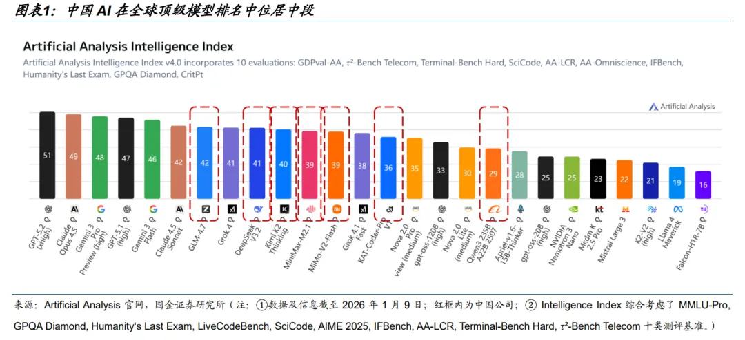 (1)GJZQ:大模型迭代不断, 中国模型已有效改变了北美单极主导的竞争格局。在全球 Top 10 阵营中,GLM-4.7、 DeepSeek V3.2、 Kimi K2 Thinking 已占据 3 席。推理需求激增: o1 类推理模型的出现,使推理阶段的计 算量相对传统模型解锁了约 10 倍的潜力,算力需求已从单一的“训练驱动”转向“训练+推理双轮驱动”。流量入口重塑: 1 月 15 日千问 App 宣布全面接入淘宝、支付宝、淘宝闪购、飞猪、高德等阿里生态业务,实现点 外卖、买东西、订机票等 AI 购物功能,引领 AI 行业从“聊天对话”迈入“办事时代”, 1 月 16 日 OpenAI 宣布推出月费 8 美元的“ChatGPT Go”订阅套餐,并计划未来几周在美国的免费用户和 Go 用户中测试广告,直接指向大型互联网企业广告及电商业务的基本盘,2026 年各家在模型、AI 应用产品上的 算力投入将进入白热化阶段。