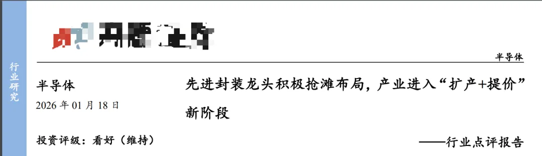 (4)KYZQ:长电科技 2025 年 12 月宣布公司旗下车规级芯片封测工厂(JSAC)如期实现通线。京隆科技 2026 年 1 月 5 日高阶半导体测试项目新厂投产,总投资 40 亿元,涵盖人工智能、车规级、工业级等高阶芯片测试领域。通富微电 2026 年 1 月 9 日披露定增预案,拟定增募资不超 44 亿元用于存储芯片、汽车等新兴应用领域、 晶圆级封测、高性能计算机通信领域封测产能提升。甬矽电子 2026 年 1 月 12 日公告拟投资不超过 21 亿元在马来西亚建设封测基地。此外,日本半导体公司 Rapidus 计划 2026 年春季在北海道启动半导体后道(封测)试产线;海力士 2026 年 1 月 13 日宣布投资 19 万亿韩元(现汇折算约 910 亿人民币)建设清州先进 封装工厂 P&T7,应对 HBM 等 AI 内存需求,行业产能扩张,龙头企业已采取积极行动。