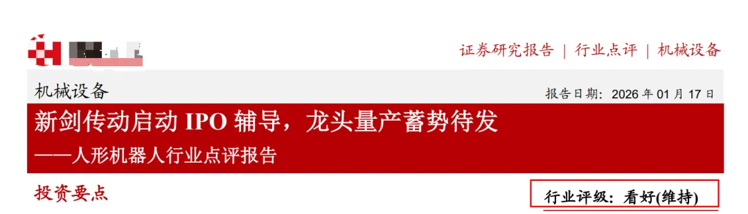 (2)ZSZQ:1月9日,新剑传动启动 IPO 辅导 ,新剑传动深耕丝杠。丝杠在人形机器人中价值量占比可达到 20%,同时,新剑传动已部署年产 100 万台人形机器人及汽车行星滚柱丝杠产业化项目的建设。
