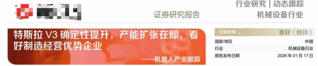 (4)DFZQ:根据特斯拉25Q3电话会,马斯克将在2026年2月-3月准备好V3的生产原型。但由于持续缺少V3公开信息,市场对V3的研发进程的担忧上升。近期,马斯克的好友卡拉卡尼斯参观特斯拉实验室,提前看到Optimus V3原型机,并给与V3很高评价,表示Optimus会超越汽车成为特斯拉的重要产品,市场对V3落地的信心会上升,为板块带来投资机会。V3落地后,产能将大幅扩建。马斯克26年计划生产5万台机器人,2030年提升到100万台。在26年底开始建设一条生产100万台Optimus机器人生产线。预计V3的落地将开启特斯拉人形机器人的产能扩建,特斯拉机器人产业链的景气度将继续。