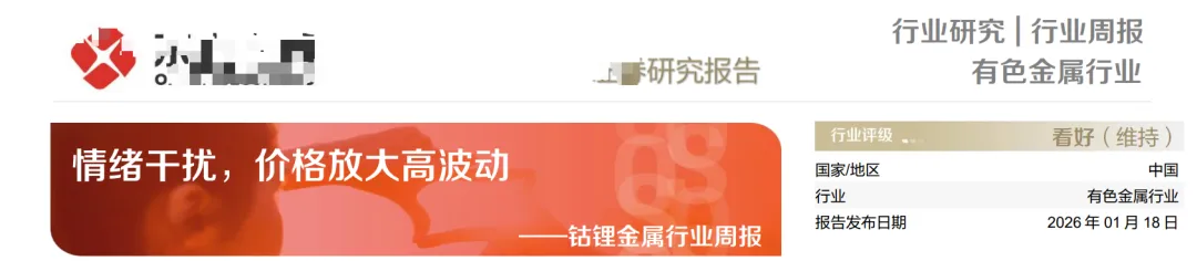 (1)DFZQ:本周锂矿价格环比上周持续上抬,海外矿山积极出售矿粉;整体大宗锂矿成交仍偏清淡;中国碳酸锂周度 产量环比上升 0.31%、周度库存量环比下降 0.24%。供应端,Sigma 锂业公告其 2025Q4 停产的 Grota 矿场将于 2026 年 1 月底前恢复部分生产;需求侧,据乘联分会 1 月 1-11 日国内新能车零售同比下降 38%,购置税免征政策结束冲击显现。短期需谨慎锂价由情绪面回归基本面的压力,春节前有望完成冲顶趋势。但 2026 年整体锂价中枢抬升趋势不改。据 SMM 数据,上周电池级碳酸锂价格为 15.2-16.3 万元/吨,均价较前周上涨 20.11%。电池级氢氧化锂(粗颗粒)价格为 14.3-15.4 万元/吨,均价较前周上涨 20.42%。钴中间品方面,主流企业延续不报价策略,现货流通偏紧;国内原料紧张格局难以缓解,价格下方支撑仍较稳固。钴金属方面,电解钴库存未见明显去化,价格震荡走弱。整体原料偏紧、终端偏弱,根据 SMM 数据,上周电解钴价格为 45.40-46.00 万元/吨,均价较前周-0.3%, 锂钴核心标的具备明确投资价值。