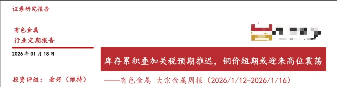 (2)HYZQ:铜:库存累积叠加关税预期推迟,铜价短期或迎来高位震荡。宏观方面,本周美国总统特朗普表示暂不对稀土、锂和其他关键矿物征收关税,铜也在美国关键矿产清单中,关税预期推迟,LME-COMEX 套利空间收窄, 短期或压制铜价。库存端,本周铜库存大幅累积。伦铜/纽铜/沪铜库存变化+3.31%/+4.81%/+18.3%;国内电解铜社会库存环比 +17.20%。中长期看,铜矿资本开支不足,供给端扰动频发,铜矿供需格局或将由紧平衡转向短缺,同时铜冶炼在“反内卷”背景下利润周期有望见底,叠加美联储进入降息周期,铜价有望突破上行。