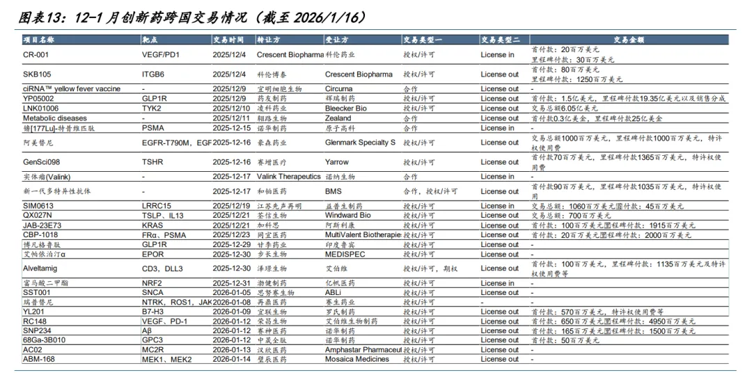 (1)GJZQ:2025/12/01-2026/1/16 期间,共计 12 款新药获 CDE 批准上市,其中 7 款为国产药物,5 款进口药物。同时,共有 17 款创新药申报 NDA,其中 13 款为国产药物,4 款为进口药物。 同时,共 27 个创新药相关跨国交易,涵盖授权/许可、合作、期权等不同形式。