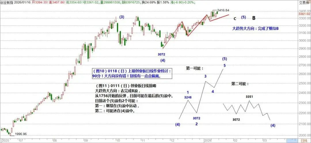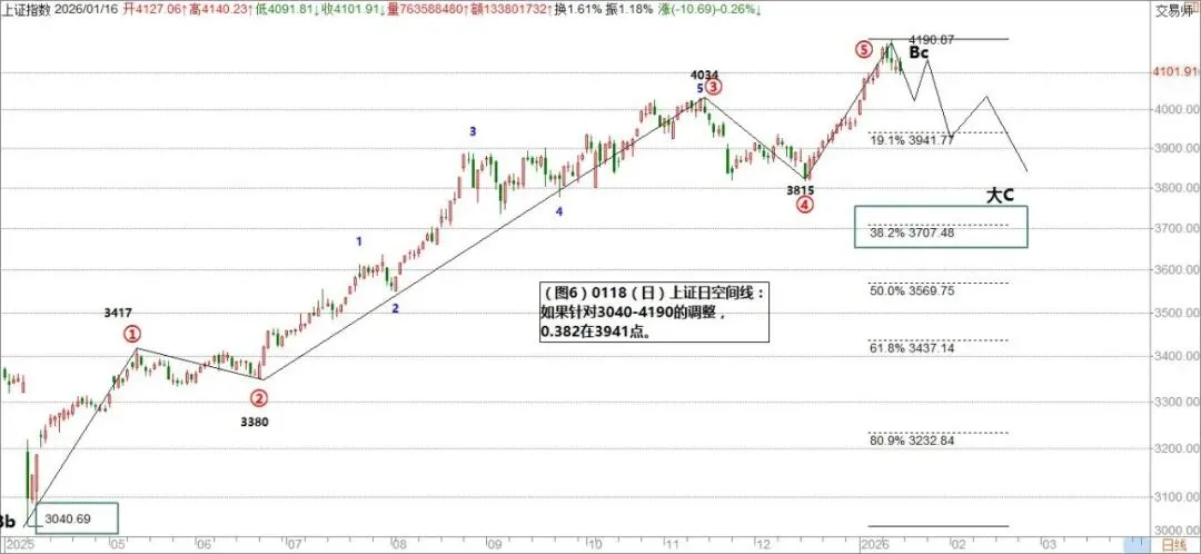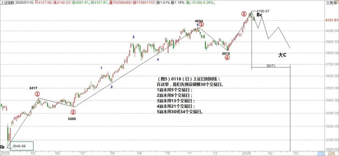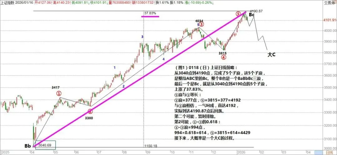 从3040点到4190点,完成了5个子浪,这5个子浪,是整段ABC里的Bc。整个B也是一个BaBbBc三浪,最后一个是Bc,就是从3040点到4190点的5个子浪,上涨了37.83%。