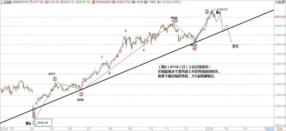 近期就看这个黑色的上升趋势线的得和失。如果下破这根趋势线,大C浪将被确定。