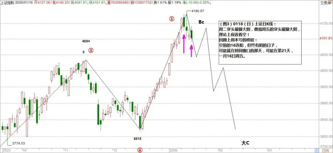 回顾上周本号的唠叨:空前的16连阳,但终有阴的日子,可能就在时间窗口的那天,可能在第21天,一月16日周五。