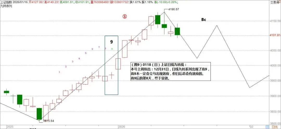 本号上周指出:12月31日,日线九转系列出现了高9,高9不一定会立马出现效应,但日后总会有效应的。