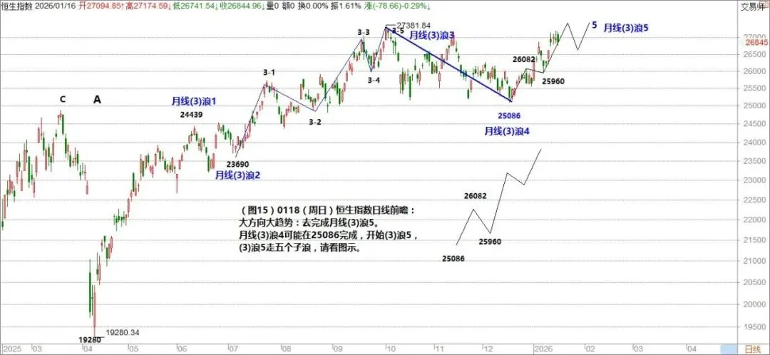 月线(3)浪4可能在25086完成,开始(3)浪5,(3)浪5走五个子浪,请看图示。