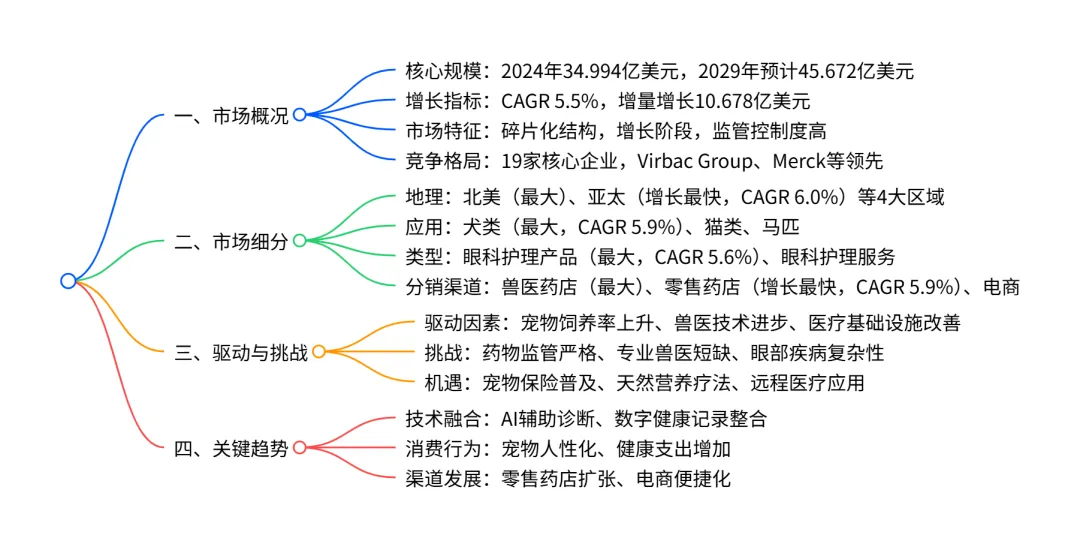 2024-2029 年全球兽医眼科护理市场呈现加速增长态势,2024 年市场规模达 34.994 亿美元,预计 2029 年增至 45.672 亿美元,CAGR 为 5.5%,增量增长 10.678 亿美元;市场呈碎片化竞争格局,北美是最大市场(2024 年占比 41.1%)且亚太为增长最快区域(CAGR 6.0%),犬类是最大应用细分(2024 年占比 42.3%),眼科护理产品(2024 年占比 78.8%)和兽医药店(2024 年占比 50.7%)分别主导类型与分销渠道细分;增长驱动因素包括宠物饲养率上升、兽医医疗技术进步等,同时面临药物监管严格、专业兽医短缺等挑战,AI 技术和远程医疗为市场带来新机遇。