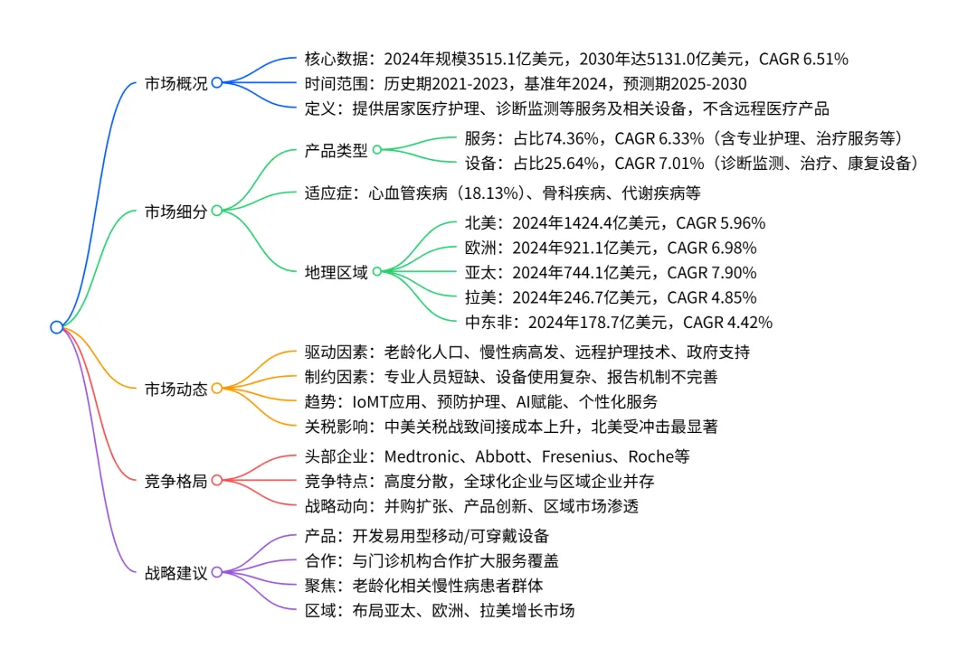 市场特点:高度分散,全球化企业与区域企业并存,头部企业通过并购、产品创新竞争。 头部企业:Medtronic(医疗设备)、Abbott(诊断与护理解决方案)、Fresenius(透析服务)、Roche(糖尿病护理)等。 新兴企业:Bayada Home Healthcare、Amedisys、Encompass Health 等聚焦区域服务深耕。 战略动向:2023-2025 年,UnitedHealth Group 以 60 亿美元收购 LHC Group,Lucet 收购 Emcara Health,强化居家护理布局。