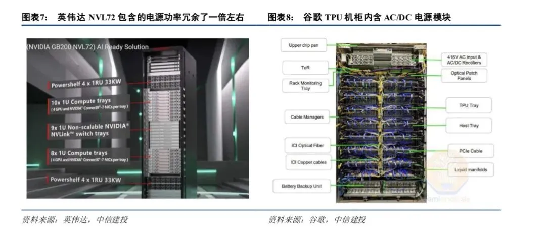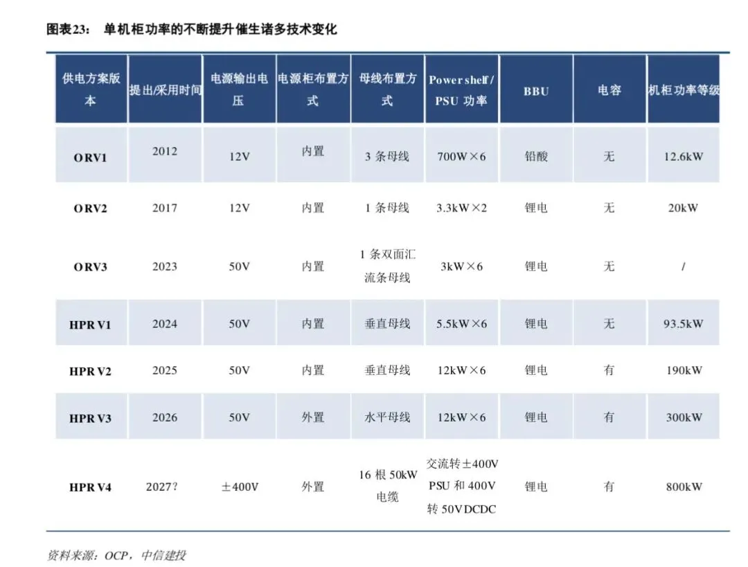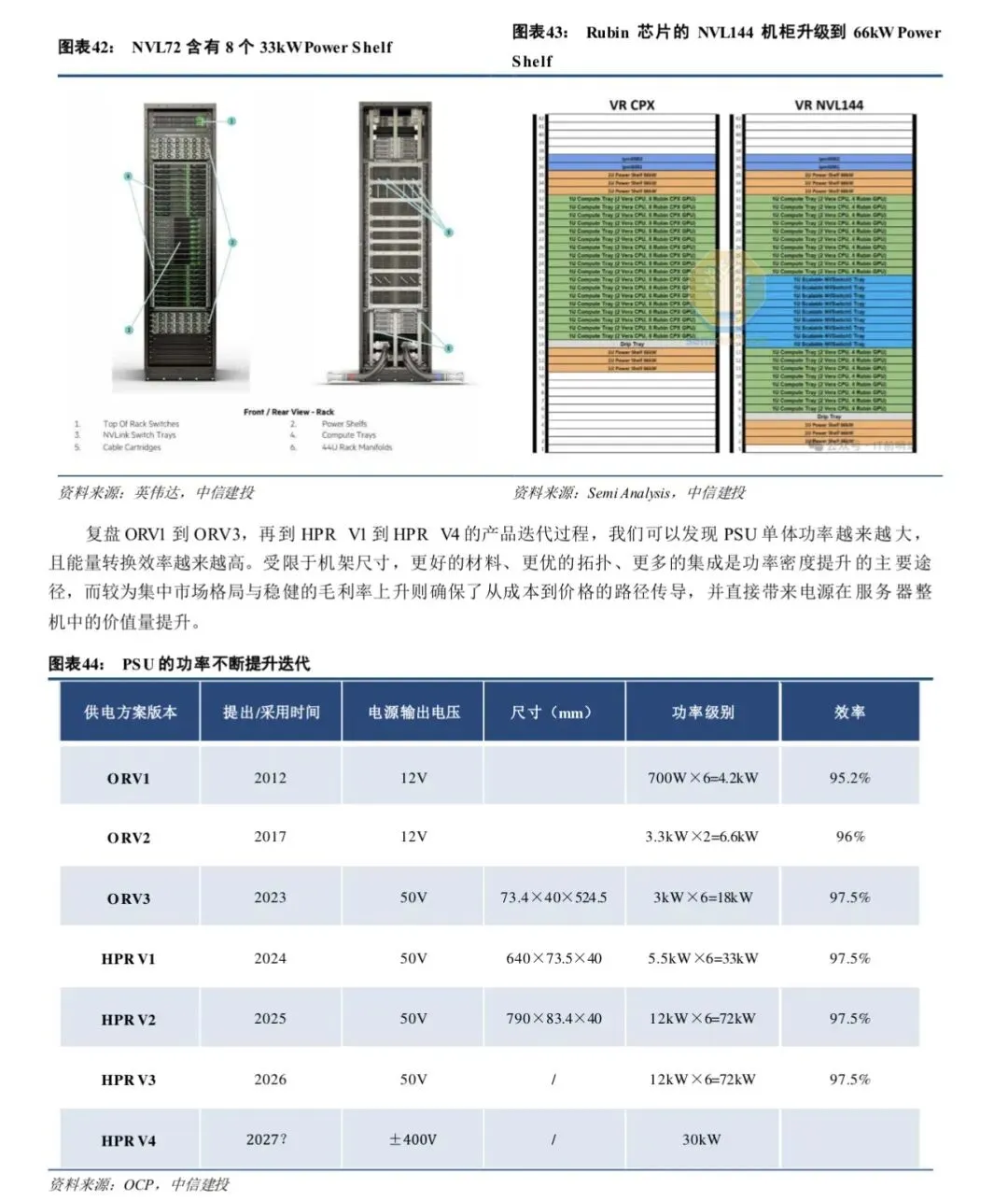 • 英伟达800V路线:迭代路径清晰,从当前415V交流供电,逐步过渡到800V直流过渡方案、进阶方案,最终实现SST(固态变压器)直供。800V方案可减少铜材使用(1MW功率需求下铜母线用量从200kg大幅降低),提升供电效率,且能复用电动汽车产业链成熟零部件。• OCP±400V路线:由Meta、微软主导,通过Mt. Diablo 400标准确立,将机架拆分为电源机柜和服务器机柜,降低绝缘与DC/DC设计难度。Meta HPR系列方案持续升级,2027年HPR V4将支持800kW机柜,适配MW级算力需求。