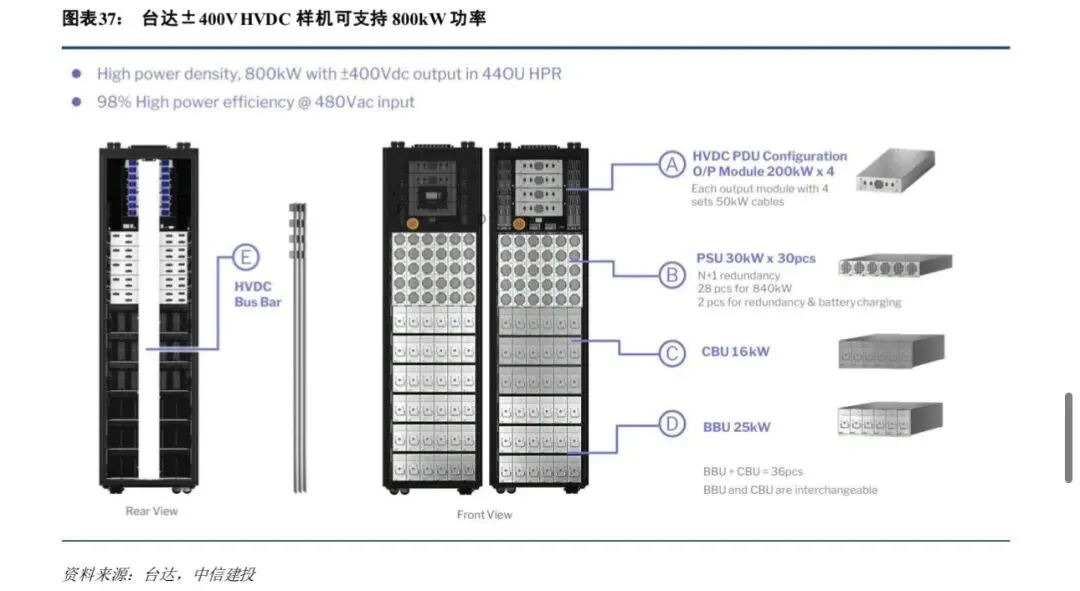 • PSU(电源供应单元):AC/DC转换核心部件,从传统5.5kW向30kW级迭代,2030年市场规模将达869亿元。头部厂商包括台达、光宝、麦格米特、欧陆通等,大陆企业凭借技术快速跟进切入海外供应链。• HVDC(高压直流电源):呈现边柜(sidecar)集成化趋势,内置CBU/BBU,单台功率可达800kW,2030年市场规模预计1257亿元。阳光电源、金盘科技、麦格米特等已推出样机并送样验证。• SST(固态变压器):终极方案,2027年后逐步放量,2030年市场规模将突破1000亿元,金盘科技、台达等走在技术前列。