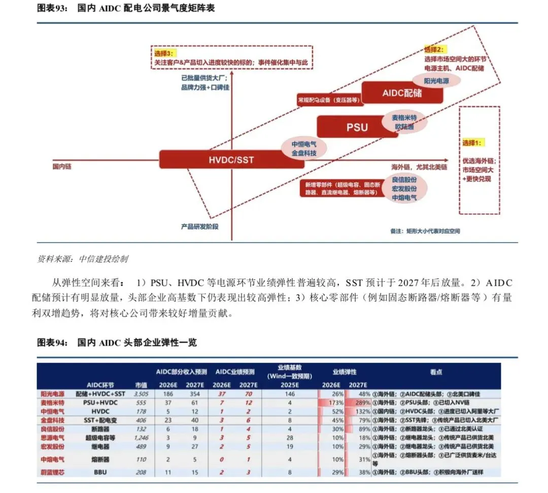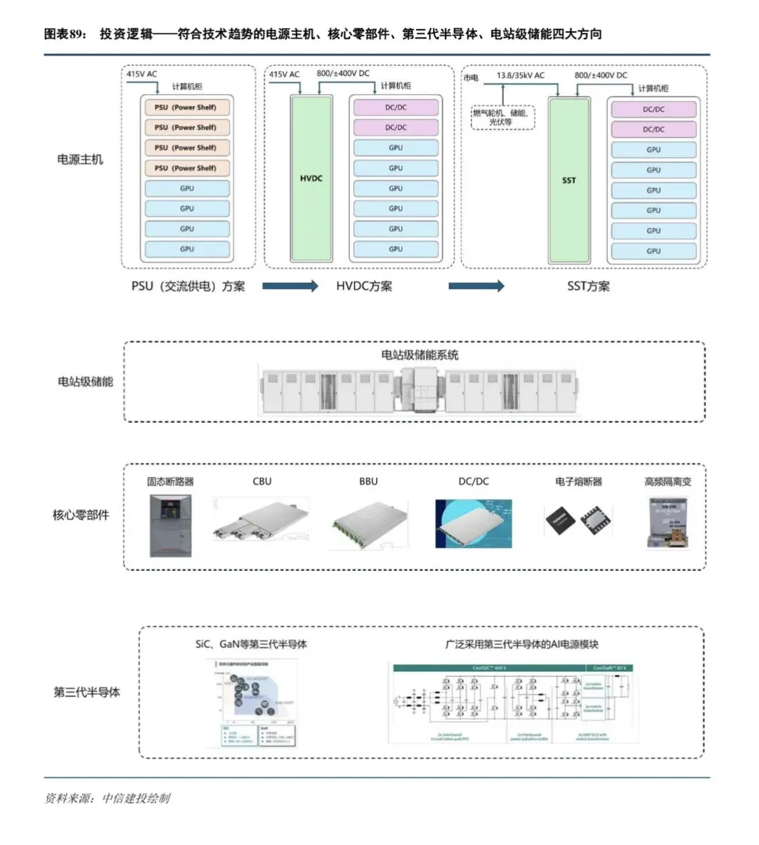 • 聚焦高价值环节:电源主机(PSU/HVDC/SST)和储能是价值量最大的两大环节,增量零部件弹性突出;