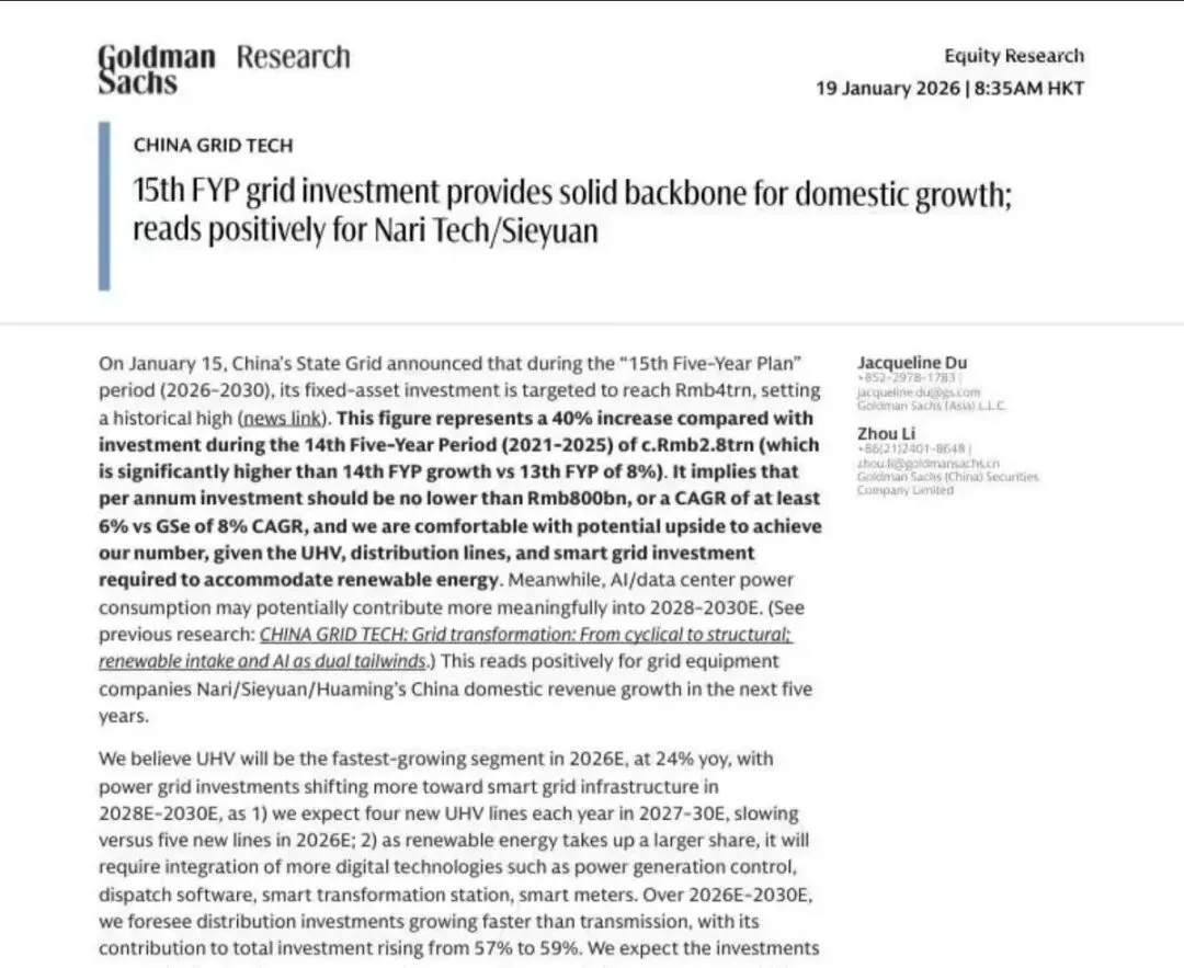 高盛于 2026 年 1 月 19 日发布的这份研报,聚焦中国 “十五五” 规划期间电网投资动态,给出了明确的乐观预期。2026 年 1 月 15 日,国家电网宣布 “十五五”(2026-2030 年)固定资产投资目标将达 4 万亿元,创下历史新高,较 “十四五” 期间约 2.8 万亿元的投资规模大幅增长 40%,远超 “十四五” 相对 “十三五” 8% 的增速。这意味着 “十五五” 期间年均投资不低于 8000 亿元,年均复合增长率(CAGR)至少 6%,而高盛预测实际增速可能达到 8%。